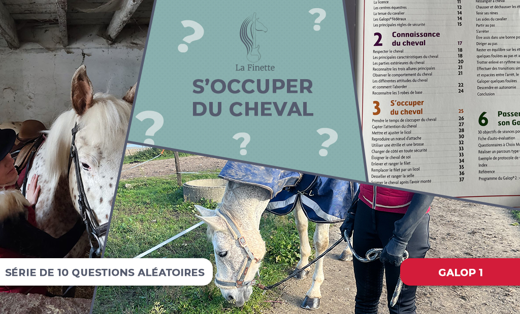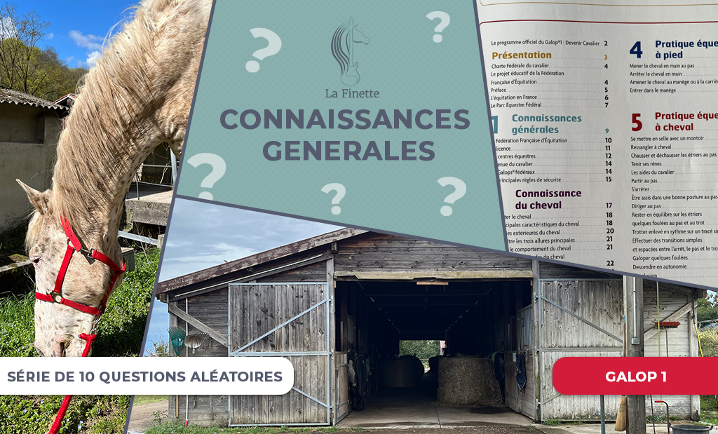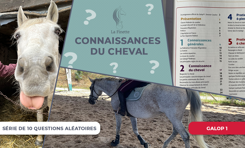 Préparez votre Galop 1 en vous amusant grâce à mes quiz interactifs. Ils vous permettront de réviser les bases de l’équitation, de tester vos connaissances et de progresser pas à pas. Le Galop 1 est la première étape qui vous permettra de valider votre niveau en équitation et d’attester de vos connaissances.