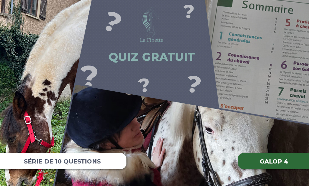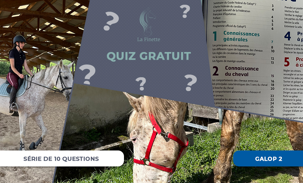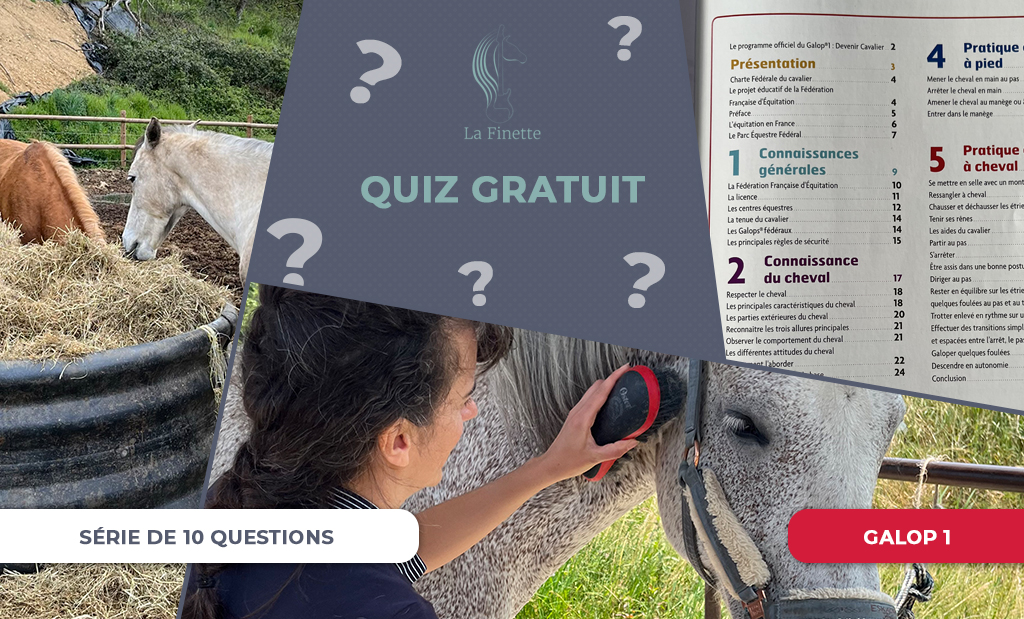 Bienvenue sur ma page consacrée aux quiz pour réviser les examens fédéraux des Galops ! Si vous souhaitez préparer vos examens de Galop de manière ludique et efficace, vous êtes au bon endroit ! Ma sélection de quiz interactifs vous permettra d’apprendre les fondamentaux du programme de la Fédération Française d’Équitation (FFE) tout en vous amusant.