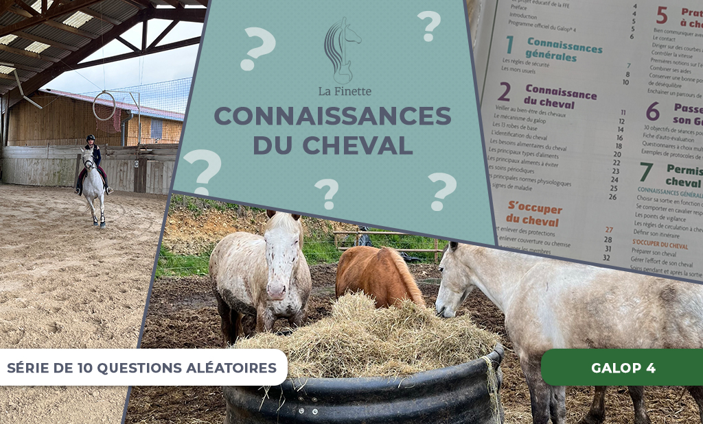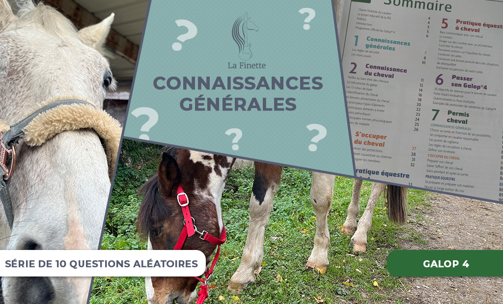 Préparez votre Galop 4 sans stress grâce à mes quiz de révision conçus pour rendre l’apprentissage simple et agréable. Ces exercices interactifs vous aideront à assimiler les bases indispensables et à vérifier vos connaissances avant l’examen. Le passage du Galop 4 concrétisera la fin du cycle de formation initiale à l’équitation et vous délivrera le Permis Cheval.
