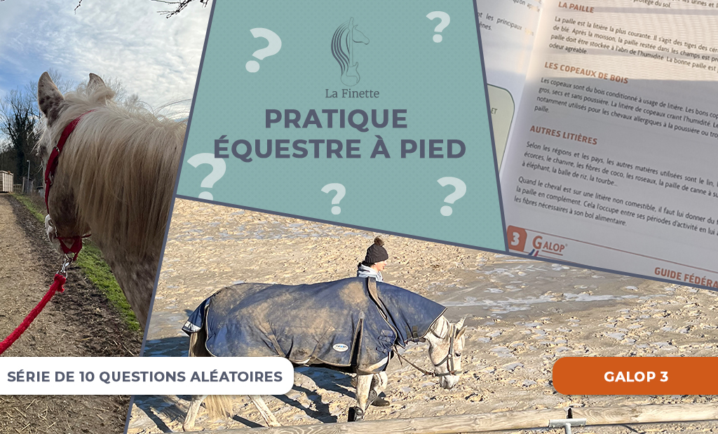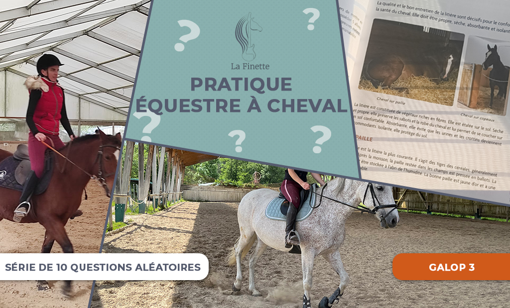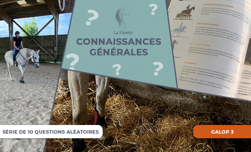 Préparez votre Galop 3 en toute sérénité grâce à mes quiz de révision ludiques et efficaces ! Conçus pour vous aider à mémoriser les notions essentielles, ils seront parfaits pour tester vos connaissances avant l’examen. Le Galop 3 évaluera votre capacité à conduire votre monture et à la contrôler. Vous aborderez plus sérieusement le saut d’obstacles et les sorties en extérieur.